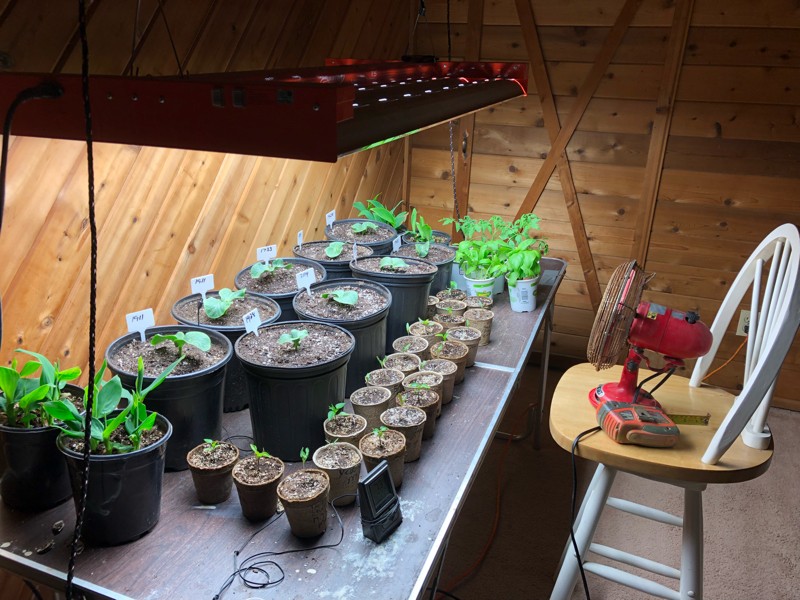 Started 9 plants for 4 spots. Transplanted in 2 gallon pots and placed under an 8 bulb 4’ T 5 light for 14 hrs a day. I find the plants grow best when the lights are 22” from the table. Temp at plants run about 80-85 degrees. I run a fan during some parts of the day when the temps get close to 85. These lights work great but can burn the plants very easily.