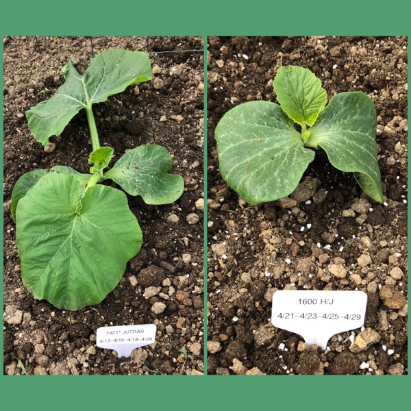 1421* Jutras and a 1600 H/J. The 1600 will be pulled if the 1135* Jutras I started looks good. It’s just starting to pop through the dirt. This spot is what I believe is the best spot in my patch. My main effort this year will be on the 1421* Jutras squash plant. Go big green!!!