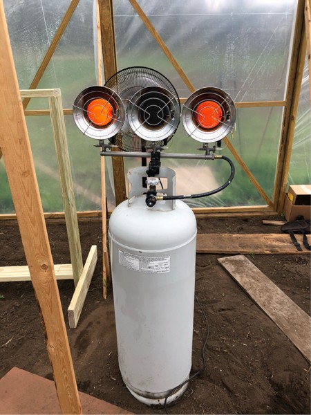 Here is the big greenhouse heater set up. I have never had to run all 3 burners usually just 2 on the low setting with the fan running behind it is more than enough.
