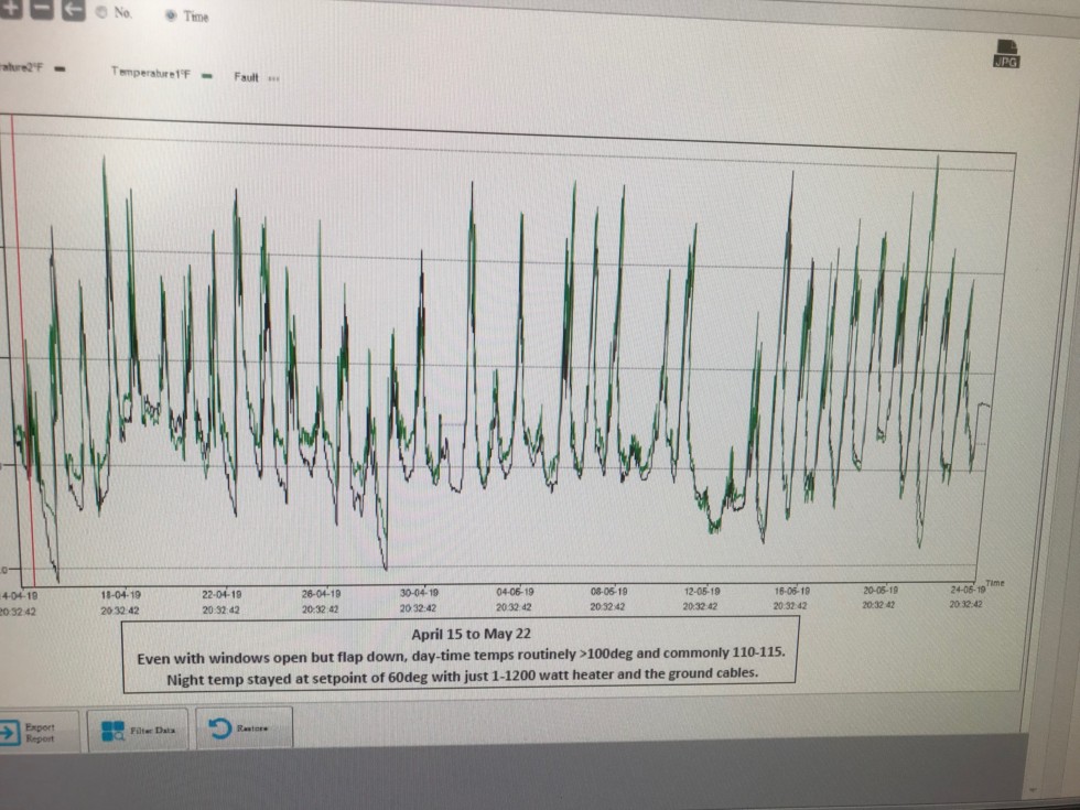 Temp graphs for last 6 weeks as recorded on my Elitech GSP-6 ($40). The Bayite BTC201 Digital Temp Controller $35 (a really neat gadget) kept night temps at the set point of 60 deg with a single 1200W heater. Day temps routinely got to be >100 with the sides vents open, with or without front flap open. Greenhouse specs for purchase in one of the March entries.