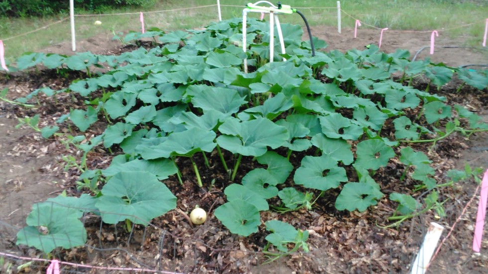 Pumpkin is softball size and close to stump but will let this one and one more on main vine continue to grow.