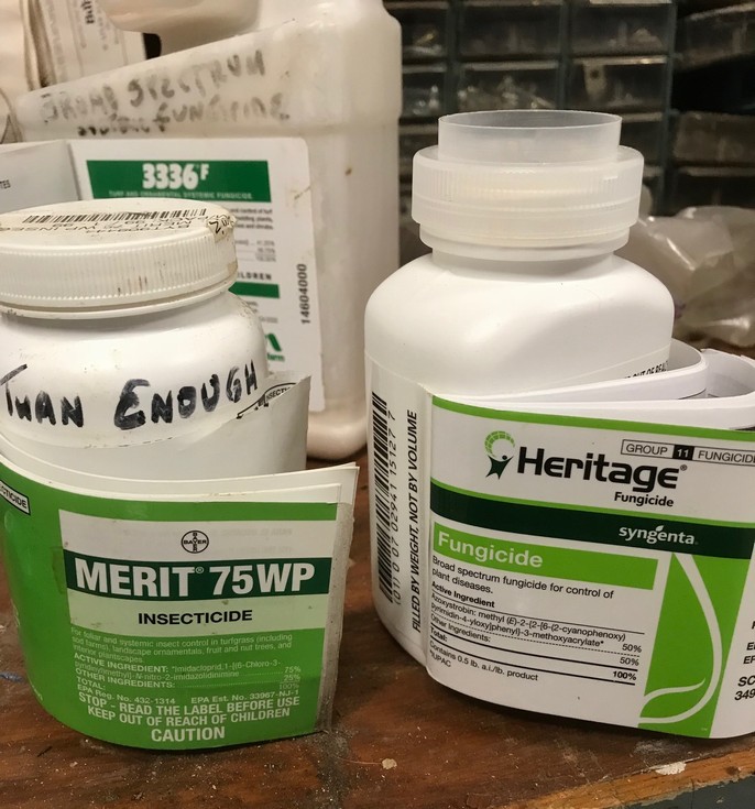 1st foliage application of fungicide (Heritage 0.4gm/1000sf) and a systemic insecticide (Merit75WP – ½ tsp.1000sf). Storms coming all week - the fungus will be on the march.