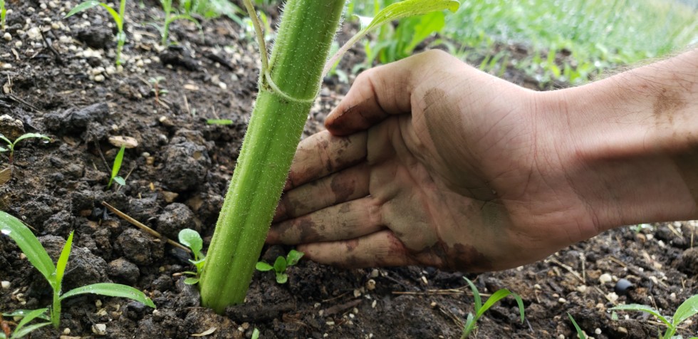 Despite all the rain & clouds, things in the garden are finally looking way up. Here is one of the larger sunflower stalks, started 3rd week in April. I will weed after the rain