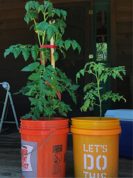 Val and I are having our own bucket challenge with some Beefsteaks that she started from seed. Hers went right into the soil. I didn’t let her on to my secret mixture but the results are speaking for themselves. It should be good news for my competition maters.