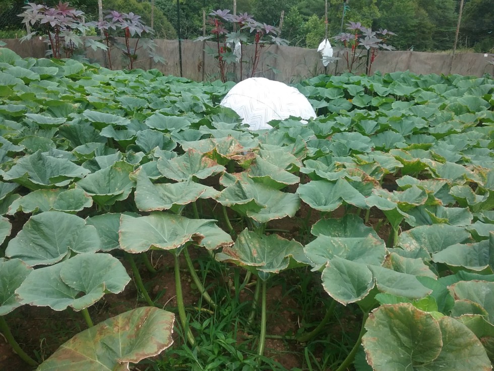 The vine is yellowing out as the issue progresses out from the stump. When I cut this stump no water dripped from it at all. When I cut the stump on a healthy vine next to this it dripped for a full 72 hours. That shows the circulatory system had been gummed up and shut down and the stump wasn't doing the pumpkin any good. Note: The stump was cut on the healthy vine because of blossom end splits on the pumpkin, in an effort to slow it's expansion down.