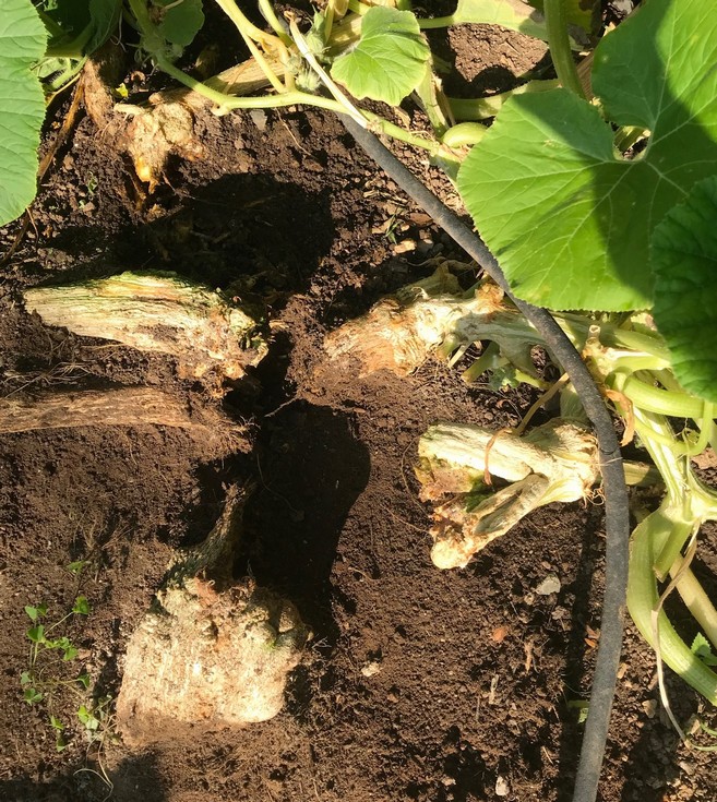 HERE IS WHAT YOU ALWAYS WANTED TO KNOW !! Do you really need the main vine at its base to grow a big pumpkin? Apparently not. I debrided all the dead material from the ground to past the first secondaries, resulting in 4 stumps. The kin 25 ft out with 23 buried secondaries, each with about 10 or more single or double roots emanating from that many buried nodes can still grow at almost 20 lbs/day. Hmmm – now that I write this and look at the picture again, I can probably rip out those big beautiful first secondaries – they’re not attached to anything!