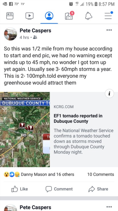 So I got hit yet again, this time confirmed tornado. I can see its path if I walk 20 yards down hill of my long gourd trellis 300 yards away in the cornfield. My patch was the furthest thing west of it that got damage. Pumpkins seem to still be ok. But a day with out their fans was noticable