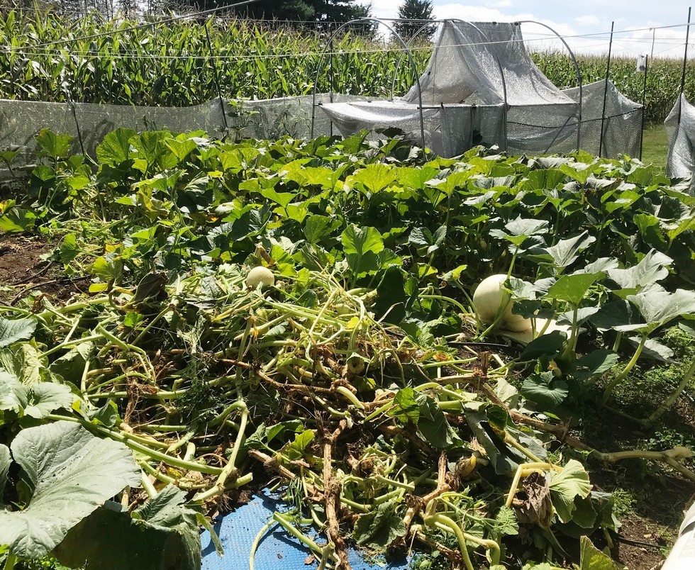 Decided to remove those large left 1st and 2nd secondaries that were attached to nothing – I couldn’t believe how much of the total area of vine they represented – almost a third on the left side! Sure not going to let THAT happen next year – remedy: bury main and connections to secondaries deeper and keep on top of matters when they poke themselves back above ground level where the vine borer wasp can find them; move the soaker hoses much further away from main stem, remove leaves around main stem to let more sun in, install a fan dedicated to mainstem. This is, no doubt, why my big guy is gain weight at a glacial rate – now about 875; 126 lbs to go by weigh-in. Photo shows a small volunteer that appeared on the stranded 1st right secondary growing off its nodal roots – no harm so I’ll leave it for now.