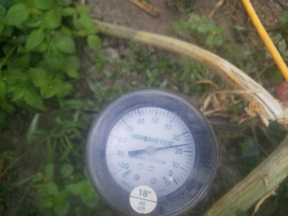 We cant get away from the rain here lately 12" since last Saturday, lot of run off making it's way through the patch. Pumpkins are staying dry which is a must at moment. My irrometer is in what I believe a dry spot it was 70% towards dry other day but so much water in surrounding areas has pushed it very wet. Finding that plants like it around 40