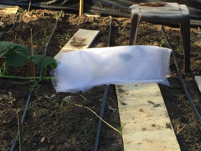 This is some folded up tulle fabric I have placed over the growing tip of the main vine of my 1935.5 Jutras squash.