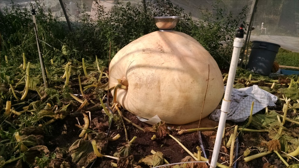 This is my 2003haist fruit. This was my strongest grower early but then it lost pace compared to a couple others in the patch. It fell out of favor with me so it hasnt gotten much attention the last few weeks. The plant really got a bad aphid infestation and didnt respond to drip tape merit or safari treaments. so yesterday, I cut all the leaves off the plant and inspected the main vine for rot and found none. I checked my new drip line layout and found out no water was moving through.Anyways, some how the valve to that plant got turned off so its likely not gotten even watering for the last 30 days and no insecticde would have made it to the root system. You cant fix stupid.