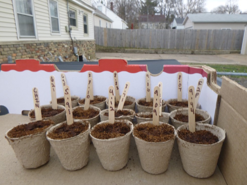 Giant Tomatoes and Giant Bell Peppers started today. It will be a good problem to have if all my giant tomato and giant pepper seeds germinate. 3 pepper seeds in each pepper pot and 2 tomato seeds in each tomato pot. I will separate plants once they have germinated. Back Row Left to Right: 695 gram Daho Pepper, 8.01 Karkos, 8.83 LaRue, 9.06 Brown, 8.07 Daho Middle Row Left to Right: 621 gram Daho Pepper, 8.10 Mac Donald, 8.71 LaRue, 8.355 Strickler, F2 Porterhouse Fron Row Left to Right: Chinese Giant Bell Pepper, 5.91 Murphy ( CA State record), 4.12 Karkos, 9.09 LaRue, 9.44 LaRue Hopefully I will not have any disasters after all of the disasters last year.