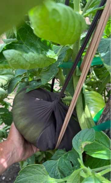 Fred flashed this morn..I’m touching the bottom middle of the fruit. Gonna let go as ripe as I can. Big fat red heavy slob.