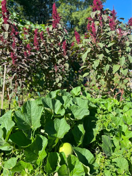 Nothing too exciting other than “Rosanna”on the farmer brown tomato plant. And this thing!!!..bout fricken time. These bushel gourds are a challenge.. and they stink. Pretty cool though. A favorite for the bunnies and woodchucks….the volunteer amaranth at about 11 ft.