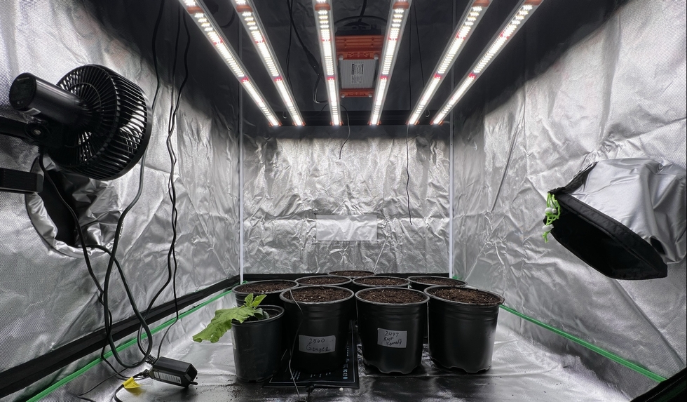 Here's a picture of all the seeds in the grow tent. The pots with plants further along are just test plants that I'm letting grow as I still have room.