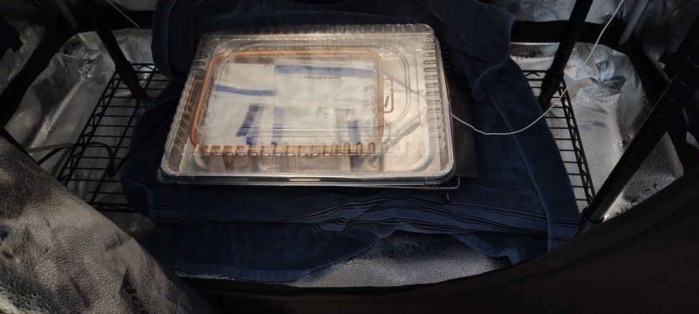 Here is my homemade incubator chamber. Use a cake pan and wire rack used to cook salmon. File edge, soak for 2 hours and wrap in paper towels and placed in baggies. I leave zip lock baggies partially open. I place heat mat on a wire rack so its not in direct contact with pan. Then put another rack on top of heat mat and pan on top of that rack. Wrap with heavy towel to help keep the heat in. The cake pan comes with a lid so i put my thermometer probe inside pan to get temperature.
