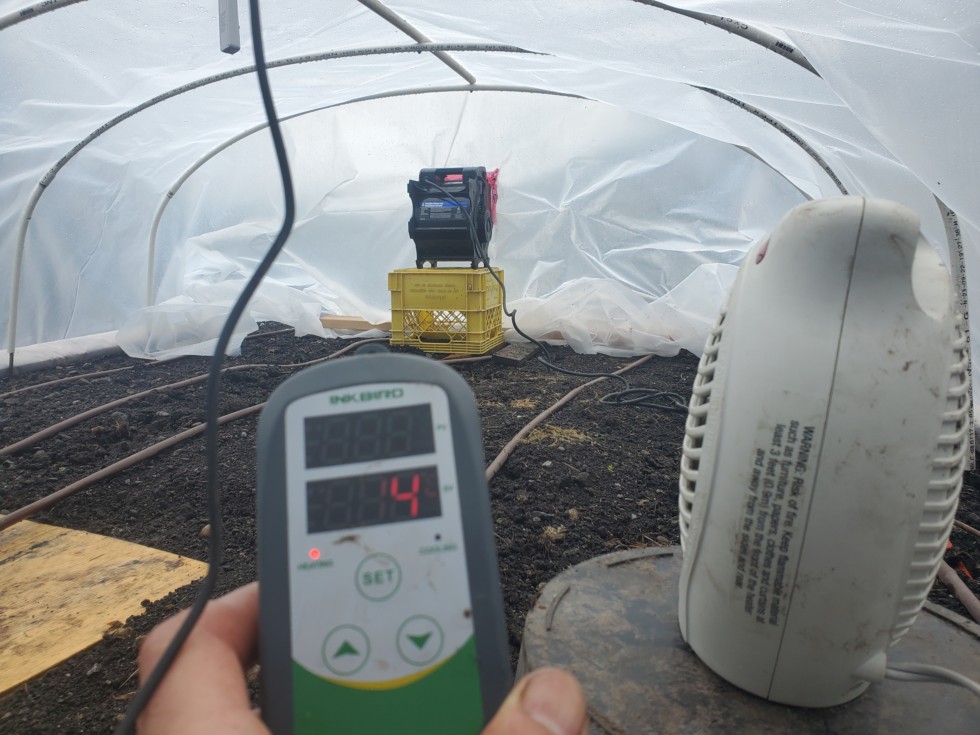 Green house up. Heater in the foreground and fan in background connected to heat/cooling controller. With the variances, ideally it doesn't get much over 30C, or under 13C. Trial run for 2 days monitoring temps then the transplant. Soil heaters on.