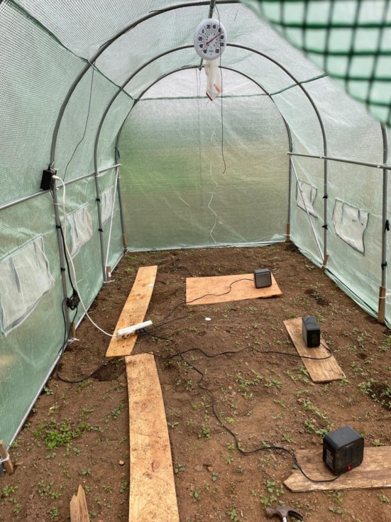 WAAAAYYY behind this season – first pair of seeds a bust, 2nd set got 1; 3rd set 4-days in pot – nothing yet. Tent all set, but alas, nothing planted yet. 2119, now 10”, ready to go when the temp improves later in the week – 85-90 deg last 4 days, now 55-60. Back to 80 in 3 days and in the ground it goes. Usual equipment, heating cables under both hills (90 deg already – likely put them in too dense and too shallow – can't fix that – actually, not willing). Commercial thermostat set 60-67deg; 3 cheapo heaters, Elitech Logger to record temp every 20min – will look at the graphs in a couple of days.