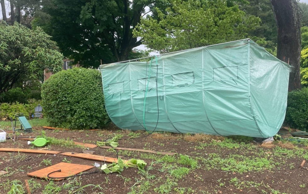 Puff of wind, greenhouse upside down, the 2117 was ripped out of the ground. After 6 seeds started, Left with 2 – the young 1565 and the infant 2040 – the 2040 transplanted in the other direction (actually, that one looks pretty good, just small so far). Gave up on the greenhouse and put up wind fence on what I had still in the ground. Can't believe anyone is following this disaster of a season, except those nasties wondering if I'm the first out. Why do we do this?!!