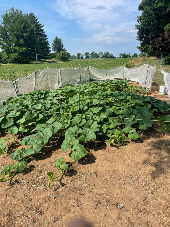 Both vines, 2040 and the 1565 (1 week younger) appear to finally be growing normally and reaching confines of fence– a good number of females, pollinated 4 so far, earliest 6/28 on the 2040. Wildlife camera shows 4 buck in velvet (3-6pt and 1 4-pt -and their entourage of ladies and kids roaming the soybean field along my fence line most nights – No attempted entry so far.
