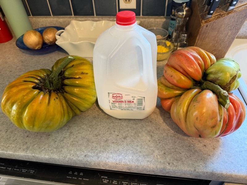 Came home from visiting our son and daughter in law in NH to find a few tomatoes blushing. On the left is the now 5.56 Young 25 from the 8.63 Clayton and on the right is the 5.83 Young 25 off of the 7.28 Jolivette. We will seed both of these seeing they are over 5 pounds.