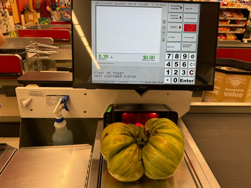 We were fortunate to weigh one more tomato over 8 pounds for us with this 8.18 pounder. This was from the 7.91 Trombley 2025. The circumference was 30.25 inches. I could have waited for it to blush more but the plant was almost dead and I didn't want to take a chance with any rot spots developing.