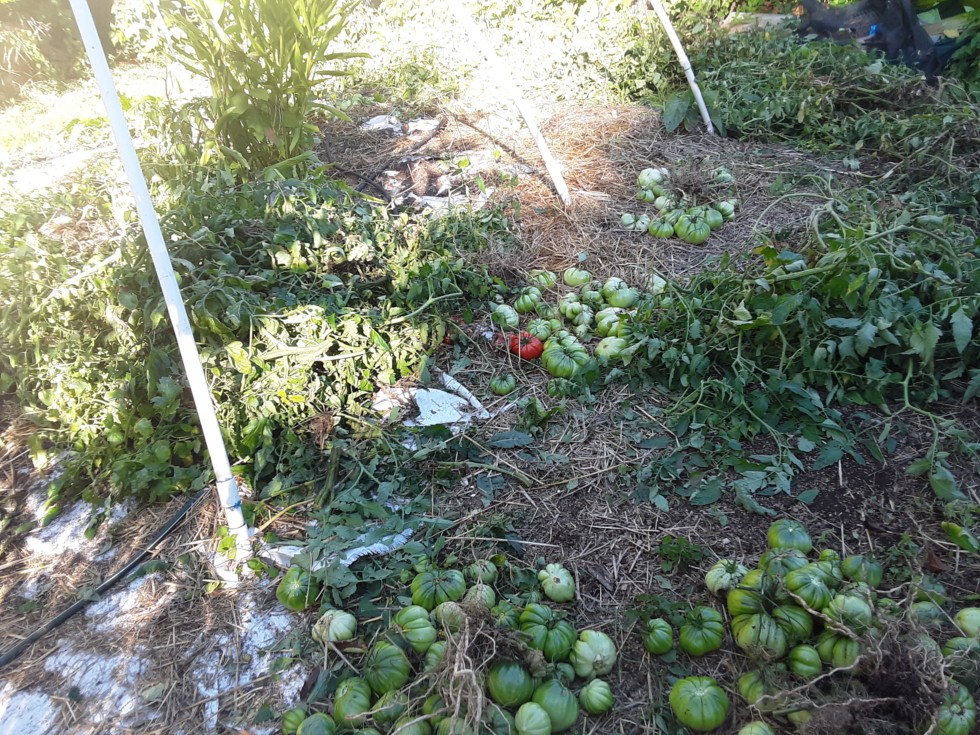 Tomato patch clean up. Each pile was its own plant. Didn't see any huge production differences, except the most diseased plants produced less.