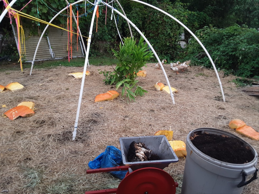 Moldy coffee grounds and pieces of rotting pumpkin. I dont think the coffee will benefit the tomatoes but the red wrigglers will like it. I am going to have to hope for a lot of rain this winter, to wash all the excess nitrogen and sodium/chloride out!
