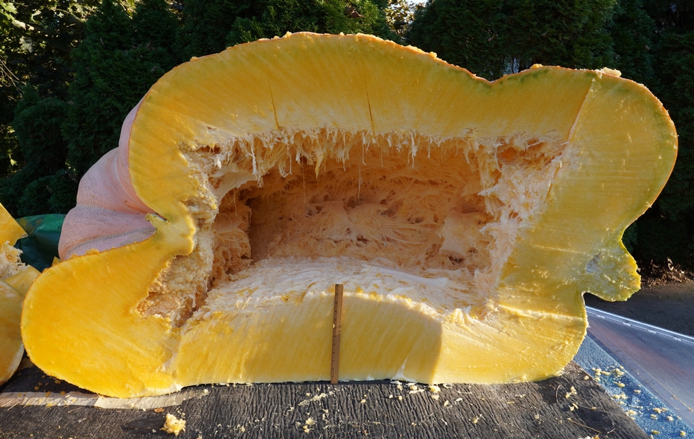 The bottom floor of the pumpkin there is a rule stood up vertically that is 12" in total length, which shows the thickness of the pumpkin rind at about 11".  Overall, a thick pumpkin with no areas of concern in regards to structural integrity as seen in this cross section.