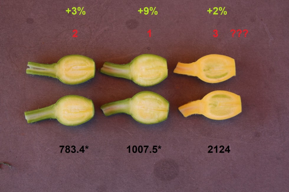 | So, now, as we got this year's official results, I get back to the prediction I made on June 22nd...where I predicted the order of +/-% of the fruit of three of the plants depending on the wall thickness of the females. Here we go: The 1007.5* plant produced the 9% heavy 852.7 Wagler 25 ("Beasty"), my kids' 783.4* plant produced the 3% heavy 808.9 Wagler 25, and the 2124 plant produced my 2% heavy "Beaut" 990.8 Wagler 25. So, my prediction was fine, and I was glad that the 2124 plant's fruit went heavy at all. :) |  |  |
