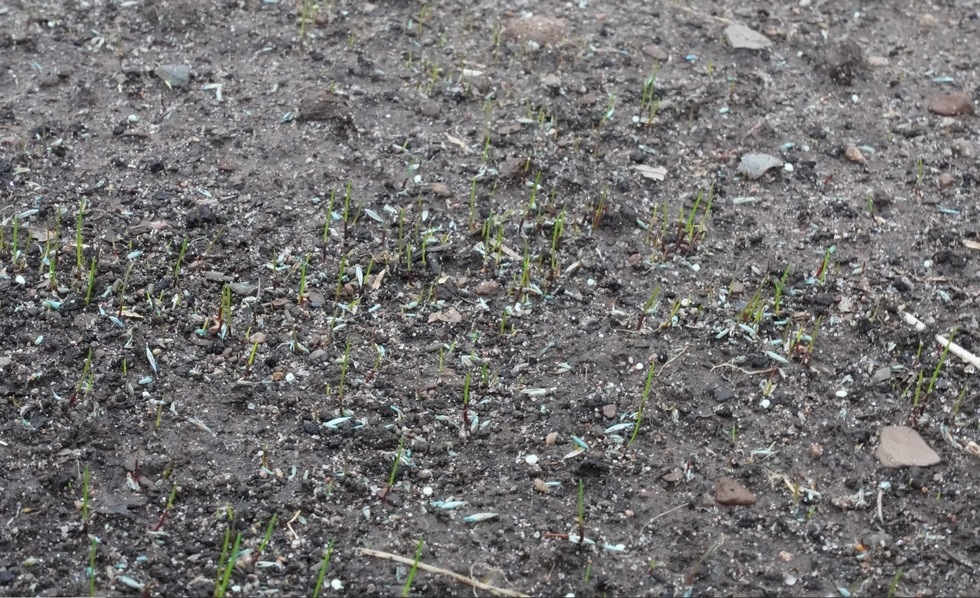 This time of year, has frequent cold nights so it is nice to see the grass seed emerge about 10 days after the initial seeding.  The key is to rake the area well, put down a heavy seeding which is about 10-12 pounds of grass seed per 1,000sq.ft. and water it daily.  In the summer seeding, repeated watering per day works great, but this time of year one watering each day seems to work out well.