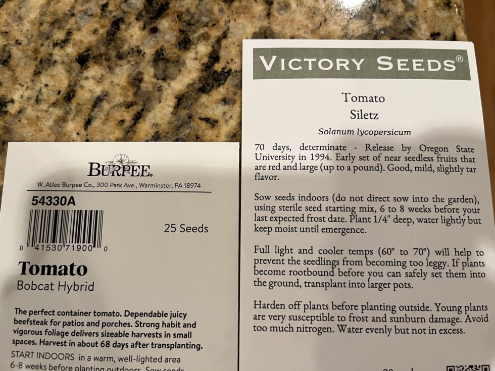 I started some early season determinate tomatoes today. This is an experiment to see how early in the season we can harvest tomatoes. Will grow one plant of each in containers that will hopefully benefit from the microclimate against the west side of the house. They will be brought inside on cold nights too.