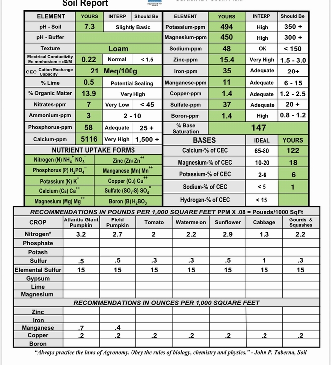 Soil analysis to start this year. I plan on adding ammonium sulfate to bring down the pH and add nitrogen, in addition to elemental sulfur, and feather meal. I will add the sulfur now as it takes a while to breakdown and lower pH. I will add the rest of the amendments closer to planting to minimize loss to leaching before I have plants on the ground. Boron was within the normal range, but this needs to be higher to help with Calcium movement. I definitely do not need to add any calcium thanks to all the limestone in our area.