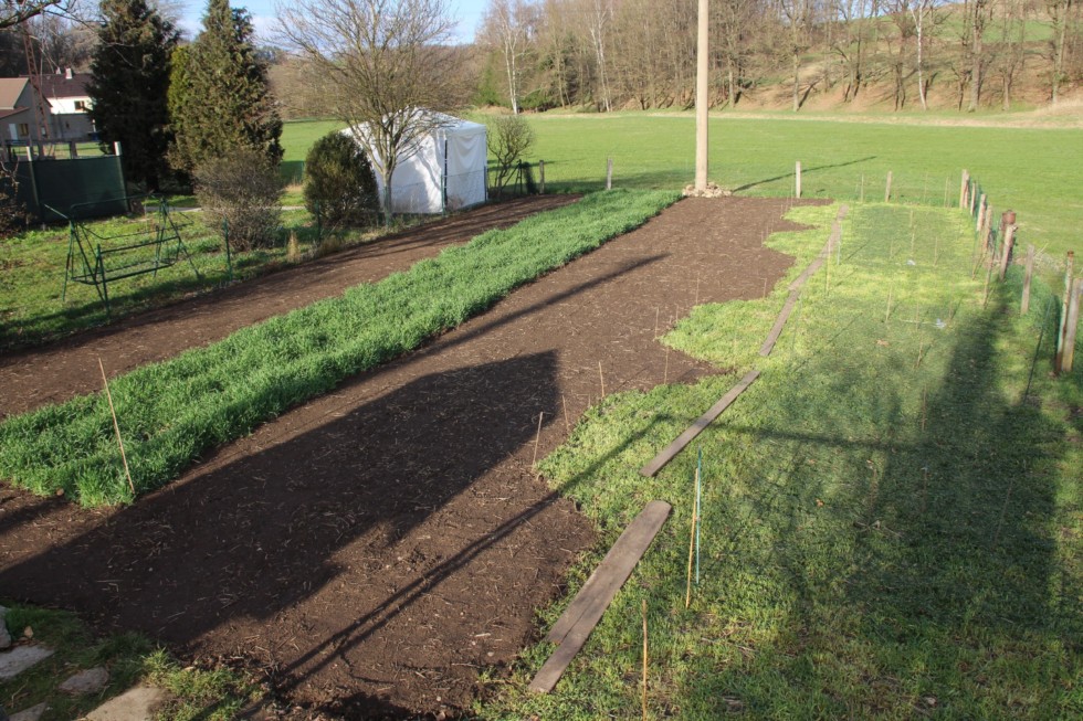 ...and one day later, the cover crop (mustard) is sown in all the places where you can see the dirt, can-watered for just in case that there will not be as much rain as I am hoping for, and some prep of the planting sites has also begun.