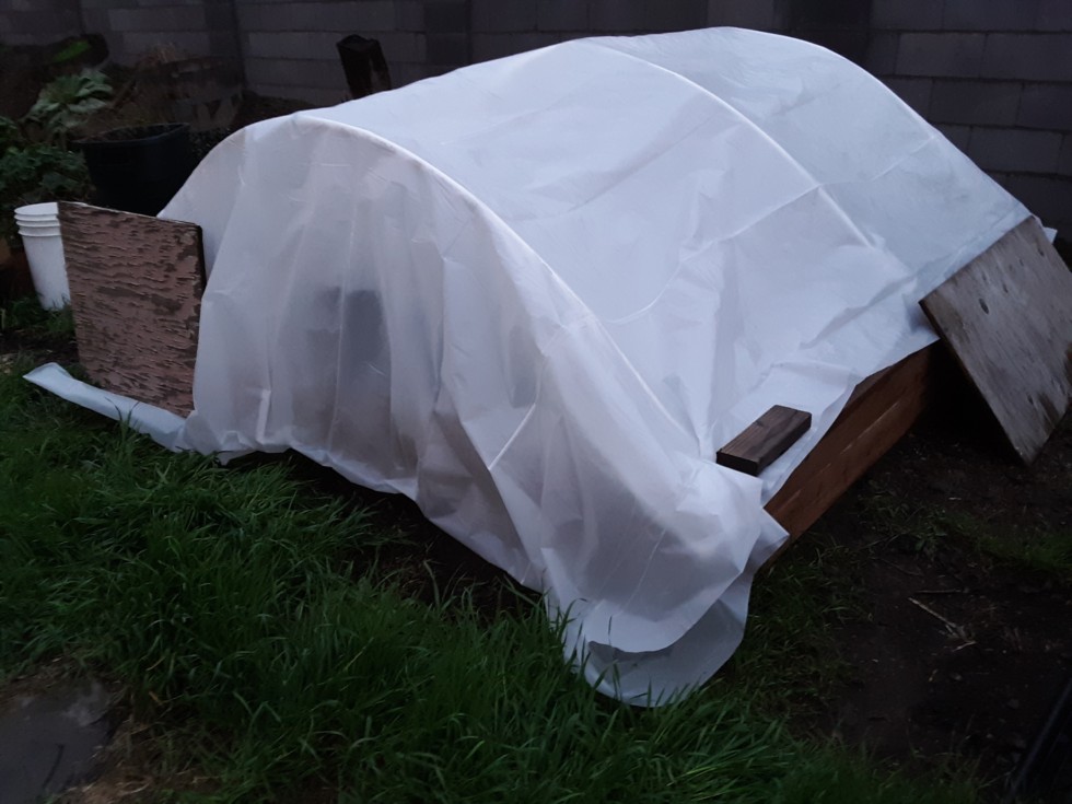 Tomato hut at my mom's. . Way too early to be planting tomatoes. About a month ahead of last year. Also a giant tomatillo and some Easter egg plants.