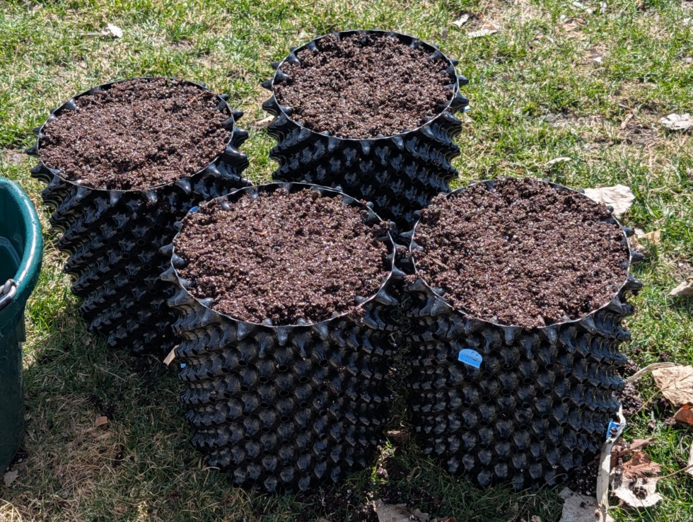 Decided to try air pots this season. Probably could have opted for a size down, but the seedlings should not get root bound. Threw some old Root shield and MT-17 in with the potting mix to start get the biology set up.