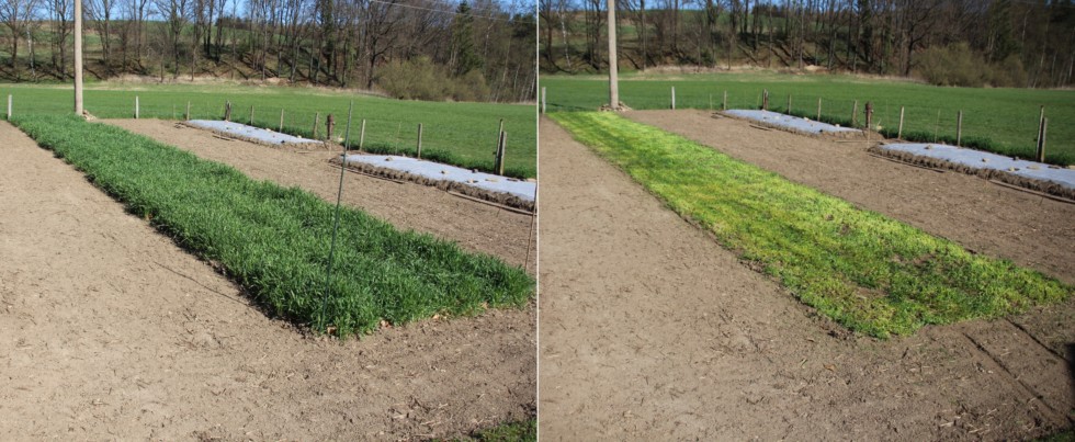In principle, I turn the soil of my patch twice every year (using a spade), and the way I turn the soil depends on the purpose. In fall, just after removing the pumpkin plants and the weeds from the patch, I usually spread compost and other amendments, mix everything into the soil using a roto-tiller, and then I turn the soil by making use of the full depth of my spade (basically turning blocks of soil) before sowing the winter cover crop. In spring, when there is cover crop on top...and perhaps some weeds as well...I want to retain the structure in the deeper soil and I aim at turning the greenery upside down in a rather shallow but efficient manner. For that purpose, I do not turn blocks of soil, I turn shingles of soil, and it all happens the way shown in these five steps. Step 1: I use a mower to remove most of the cover crop.