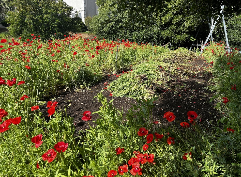 Poppy Pull - I started prep on the main patch by pulling the poppies in the planting area. I found two gopher mounds, signs of field mice, and a bunny ran out when I started work. All the critters like poppies, including squirrels, deer, rabbits and even the two-legged varmints walking by...