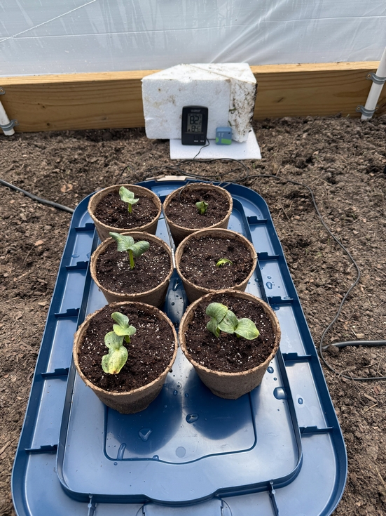 100% germination, and young plants breaking through the soil. Starting sunlight exposure right away in the mini greenhouse to make hardening off easier this year. 50 degrees outside, but the thermostatically controlled ventilation is keeping the greenhouse in the low 80's.