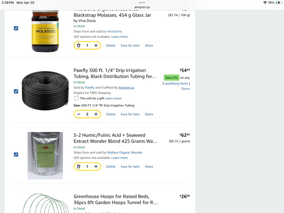 Today is the day of the big order! Hoop house things, molasses, humic & fulvic acids, irrigation things. It'll be there by the 23rd so I can prepare everything the second 8 ge5 home.
