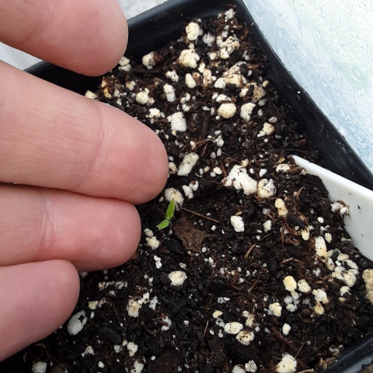 It's hard to believe this will amount to anything. Four tomato rootstock seedlings are up.