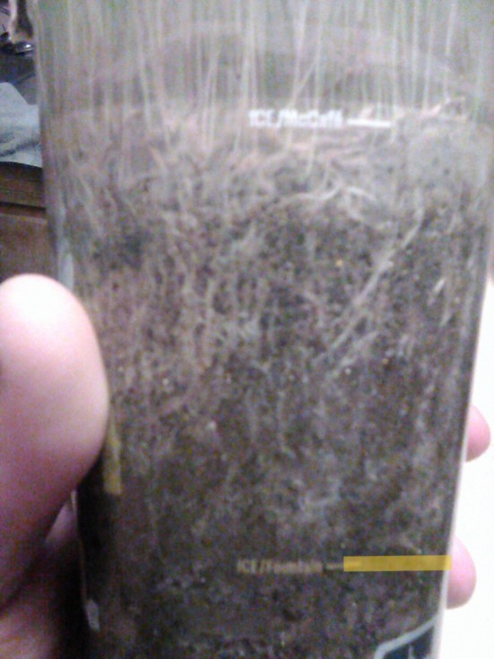 Depth of the CC roots unknown, butt at several inches. The 166's roots have not yet, if ever to be, reached the bottom, butt are weakly reaching the sides of the cup. CC roots have gone farther downward since this pic was taken on 4-17-26. The yellow line is where the roots of the CC were at at that time. eg