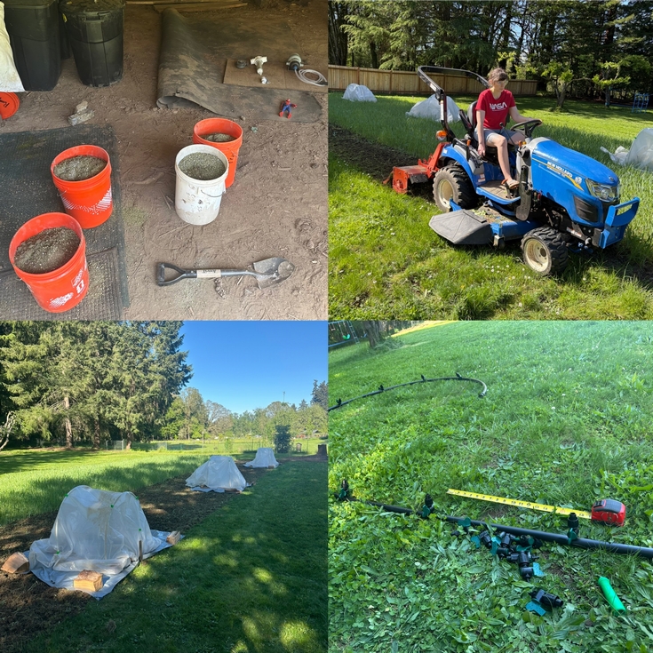 Today was a good day! Mixed the amendments for the first 1/3 of the patch and tilled it in. Tarps to warm the ground with hoop houses over. Started on the drip system too. And yes, I did it all in my adidas slides. ;)