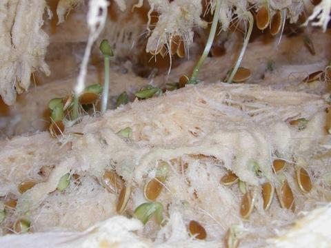 ...or your seeds either!! Opening my 555.8 revealed that at least half of the seeds had germinated inside the pumpkin. Some of the sprouts had 3 primary leaves in addition to the cotyledon leaves!! In a few areas with deep ribs, the pumpkin walls were thin enough to allow a small amount of light to bleed into the cavity, which accounts for the green color of the sprouts.