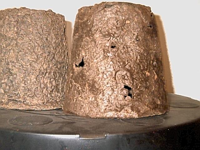 Begin with standard 6" peat pot (left), then shave peat pot walls very thin with a bench grinder wire wheel, finally poke holes in the pot. We used this technique last season with great results. Note it takes pratice and about 45 minutes each, also about 1 in 5 pots get torn, especially if drinking beer!