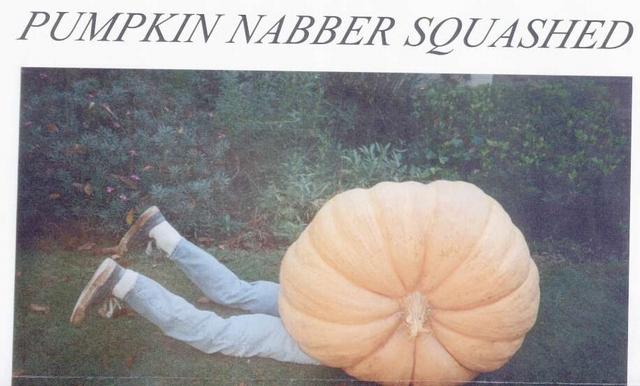 After reading and viewing the carnage done to the pumpkins grown by fellow grower Rocky Rockwell in recent days. ..it reminded me of what happened to a pumpkin I donated for a front porch exhibit. Vandals rolled this 600 pounder off the front porch but couldn't do more than roll it off and ran while the owner chased and his wife called 911. The culprits were not caught and the pumpkin remained in fair condition with a split underside from the fall, it made it through Halloween with out being carved. He displayed it at his annual party as picture shows and made front page of his local paper.
