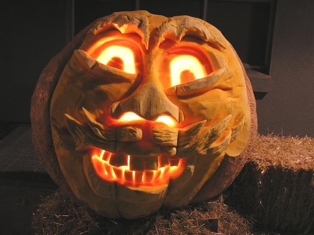 This is the winning 886 pound pumpkin carved and on display for Halloween.
