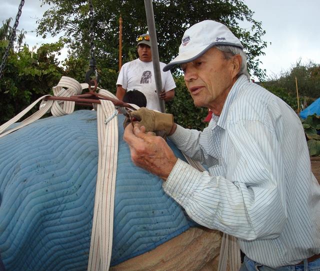 Pete adjusts the lifting straps so that the the pumpkin will stay level during lifting.