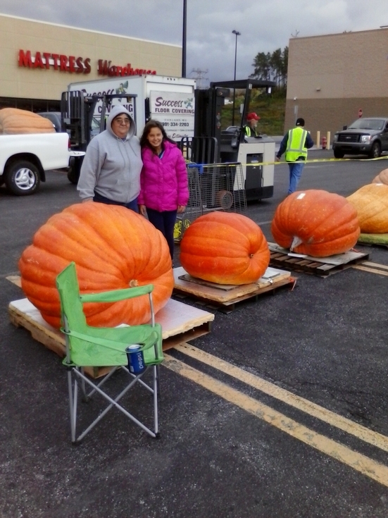 my sister and daughter with the three pumpkins I took to Altoona weigh off,all three had good orange color and good shape,
